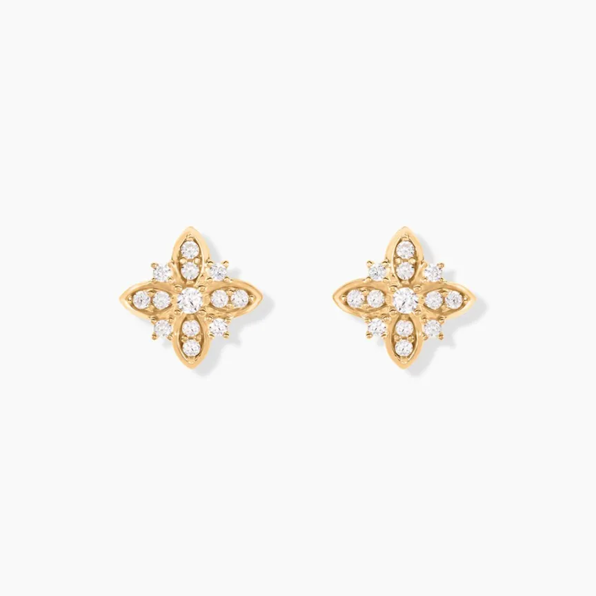 Boucles D’oreillles Puces Plaqué Or Jaune Fleurs Pavage Oxydes De Zirconium
