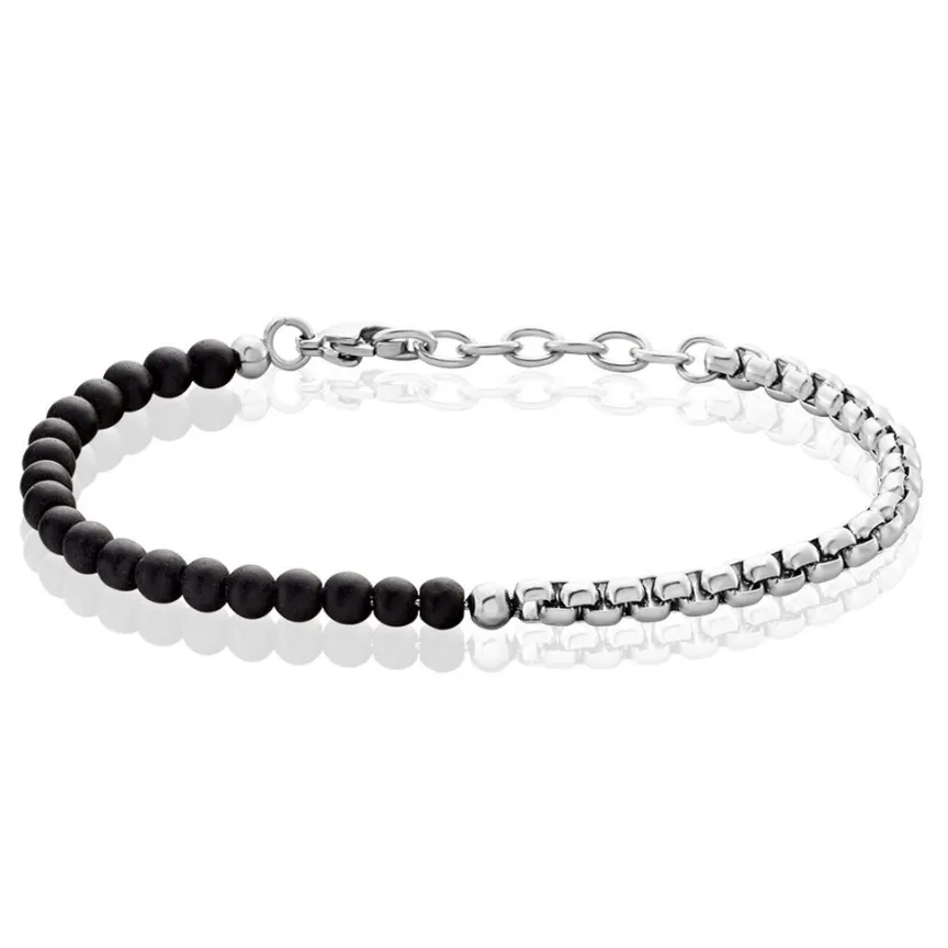 Bracelet Acier Inoxydable Blanc Boules Onyx Noir Maille Jaseron 21cm
