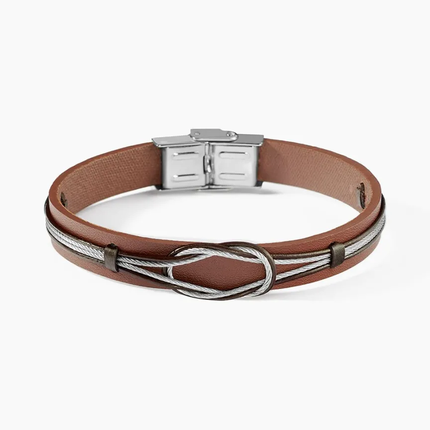 Bracelet Acier Inoxydable Blanc Cuir De Vache Marron Cable Avec Noeud Marin 21cm