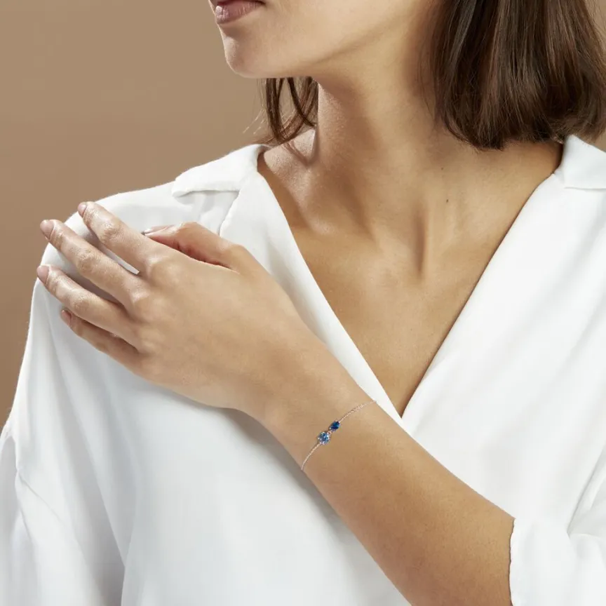 Bracelet Argent Blanc 925/1000 Serti Griffes Oxydes De Zirconium Bleu Clair Et Bleu Maille Forçat 19cm