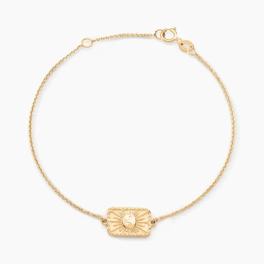 Bracelet Or Jaune 375/1000 Soleil Plaque Rectangle Maille Jaseron 16+2cm