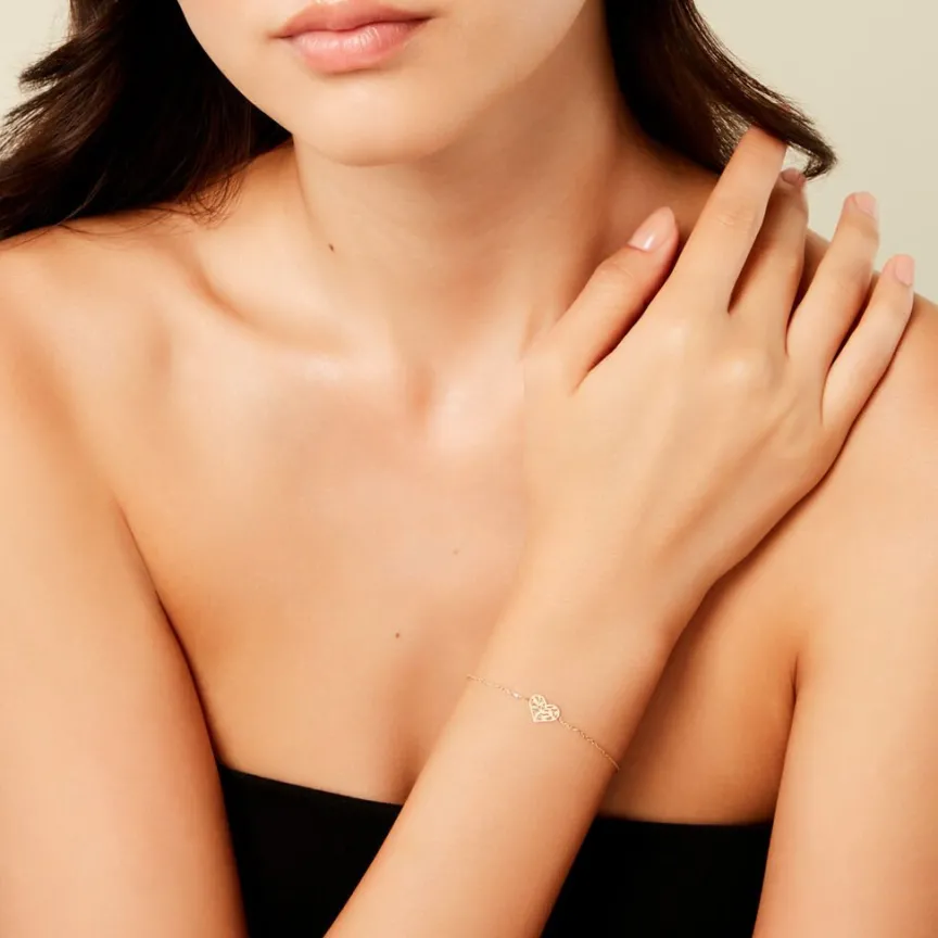 Bracelet Or Jaune 375/1000 C艙ur Arbre De Vie Maille Forcat 16+2Cm