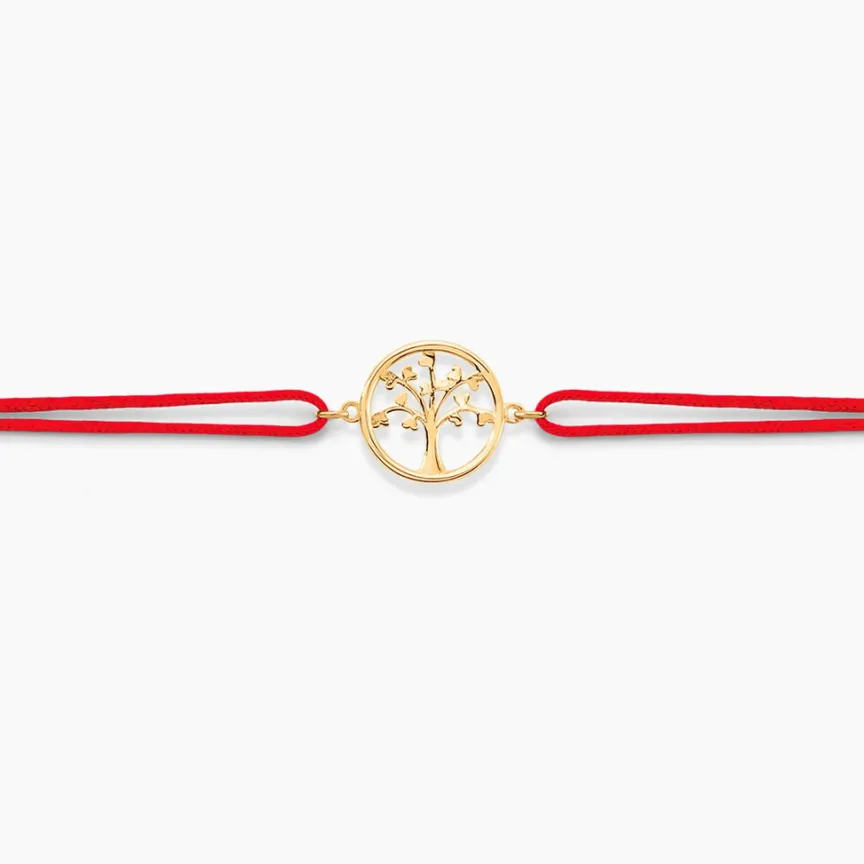 Bracelet Or Jaune 375/1000 Arbre De Vie Et Cercle Ajoure Sur Cordon Ajustable Nylon Rouge