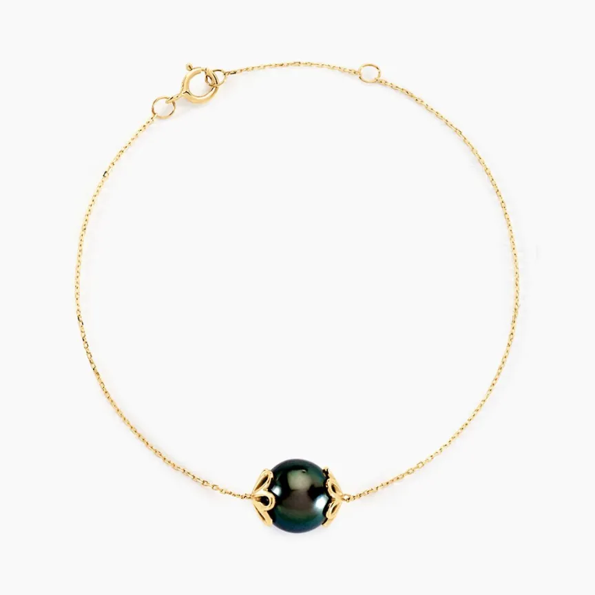 Bracelet Or Jaune 375/1000 Perle De Culture De Tahiti 9/9.5mm Ronde Motif Floral Ajoure 20cm