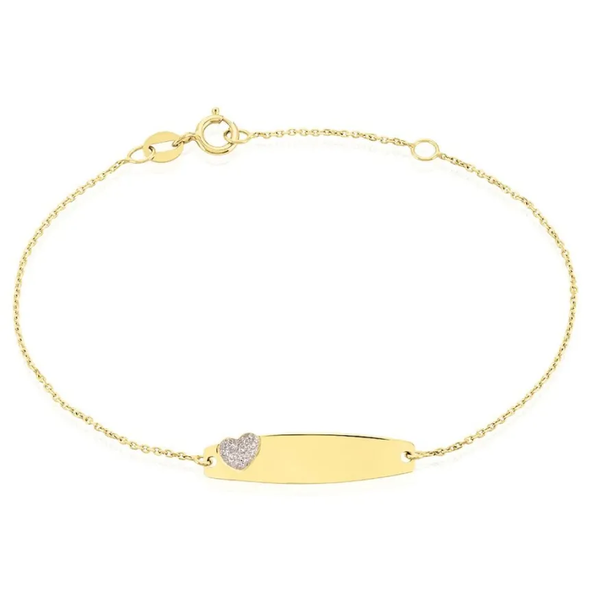 Bracelet Identite Or Jaune 375/1000 Plaque Ovale Motif C艙ur Glitter Blanc Maille Jaseron 12+2cm