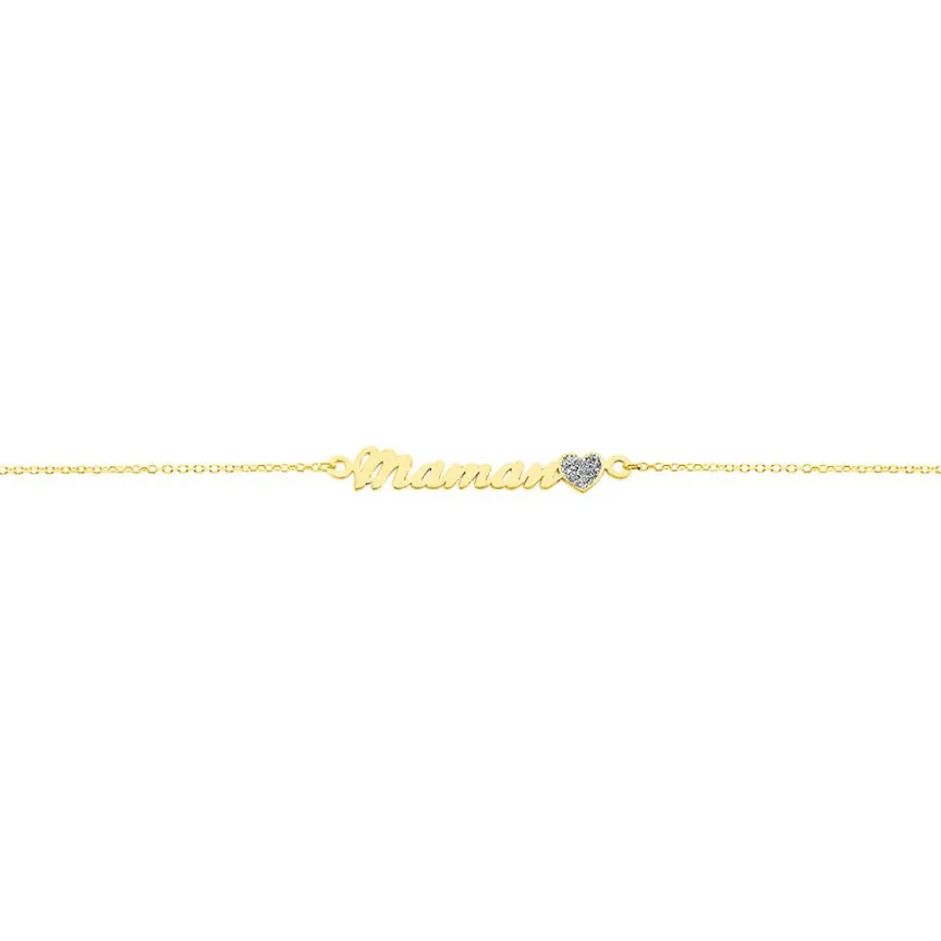 Bracelet Or Jaune 375/1000 Message Maman Lettres Decoupees C艙ur Glitter Argente Maille Jaseron 16+2cm