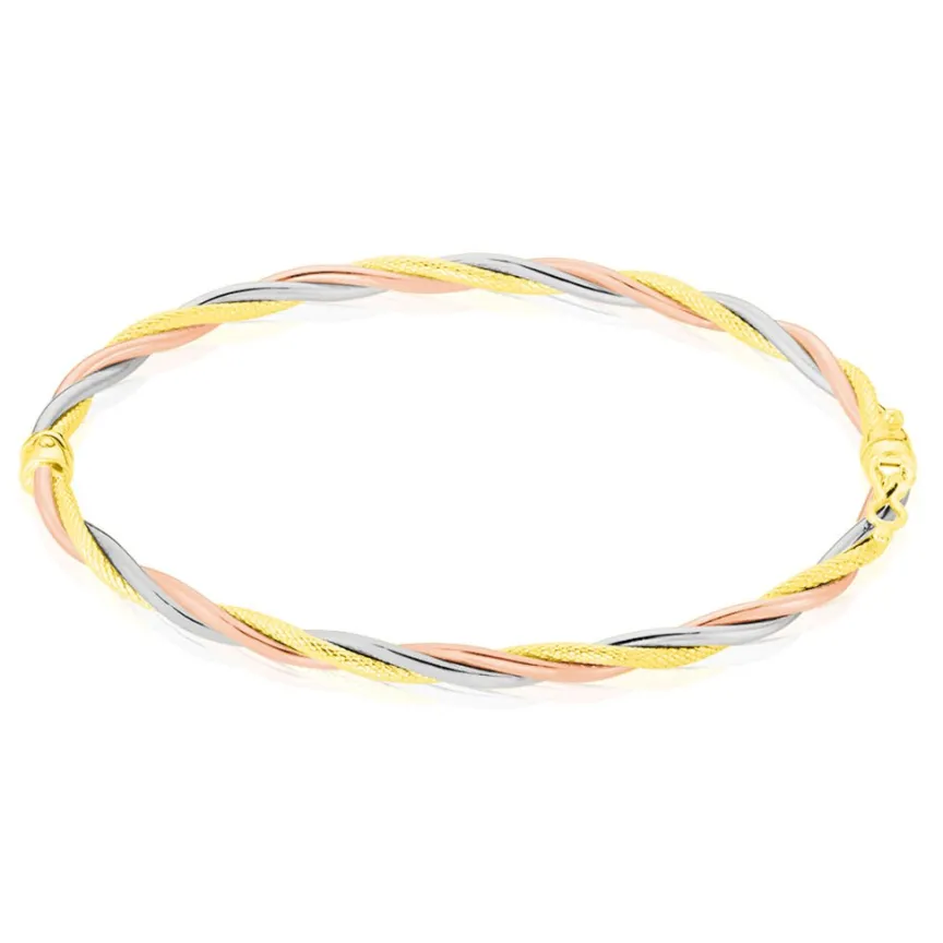 Jonc Or Tricolore 375/1000 Effet Torsade Fils Lisses Et Diamante