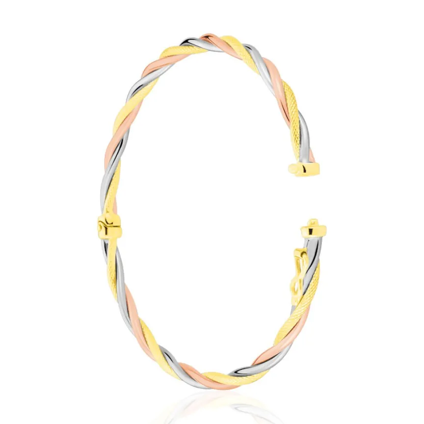 Bracelet Jonc Tricolore Or 750/1000 Effet Torsade Fils Lisses Et Diamantes Diametre 65mm