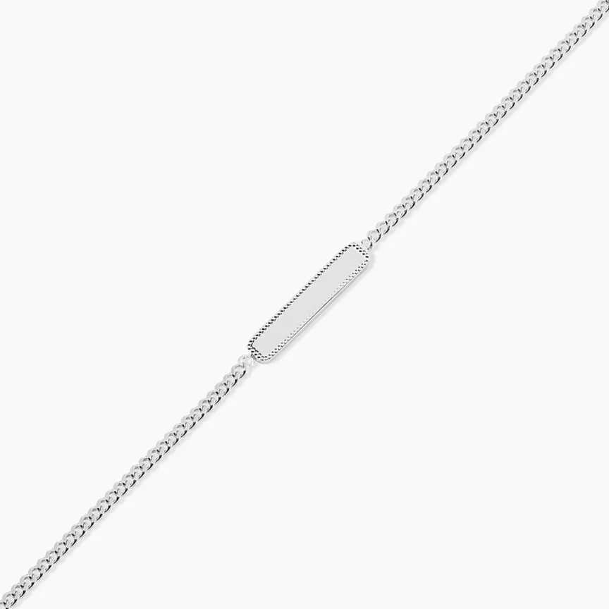 Bracelet Argent Blanc 925/1000 Plaque Rectangulaire Bordures Perlees Maille Gourmette 19cm