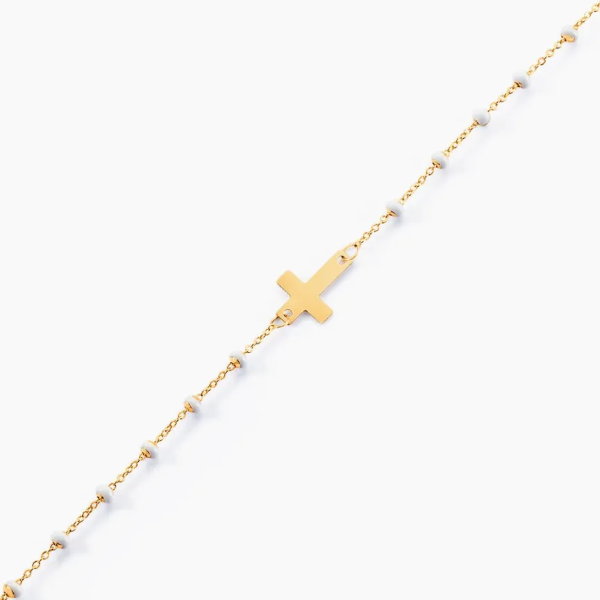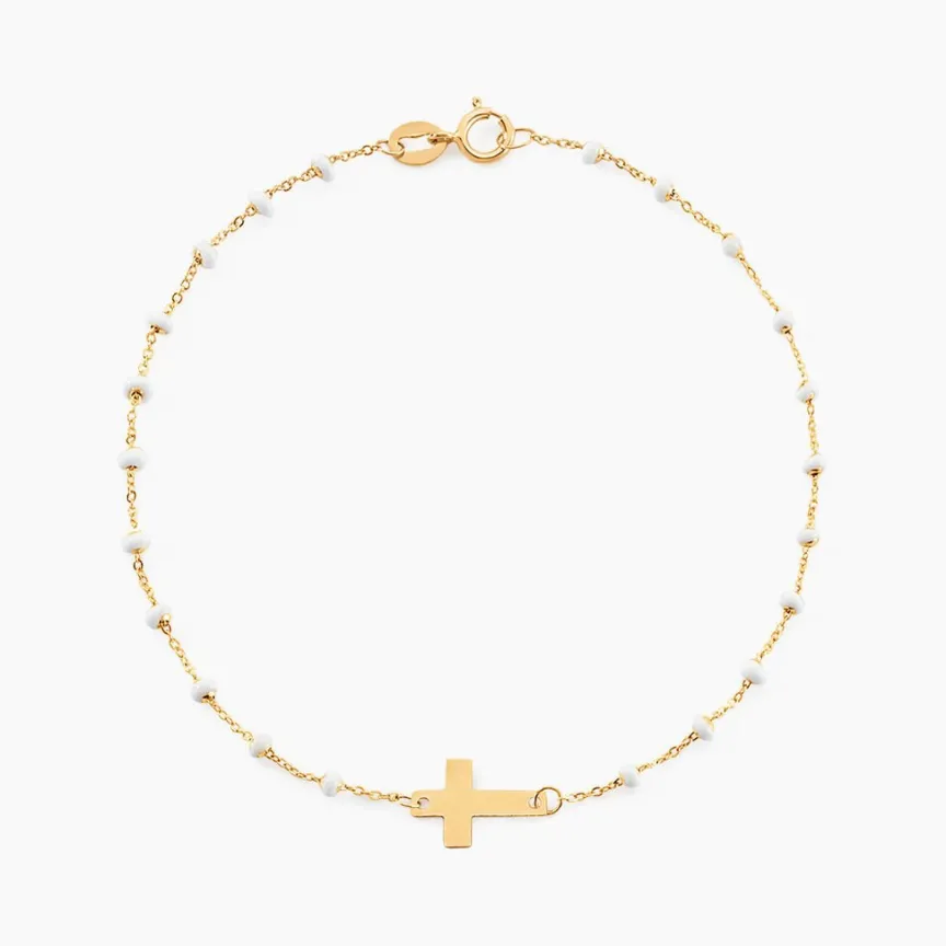 Bracelet Or Jaune 375/1000 Croix Et Email Blanc Boules Maille Fantaisie 16+2cm