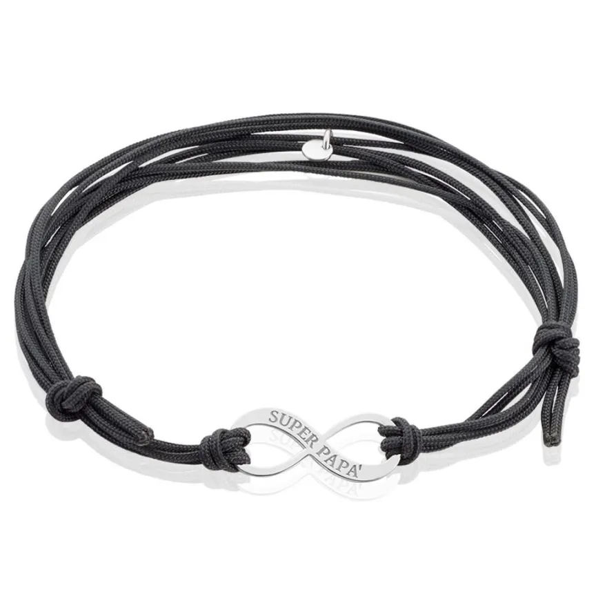 Bracelet Argent Blanc 925/1000 Motif Infini Gravé Super Papa Cordon Noir 19cm