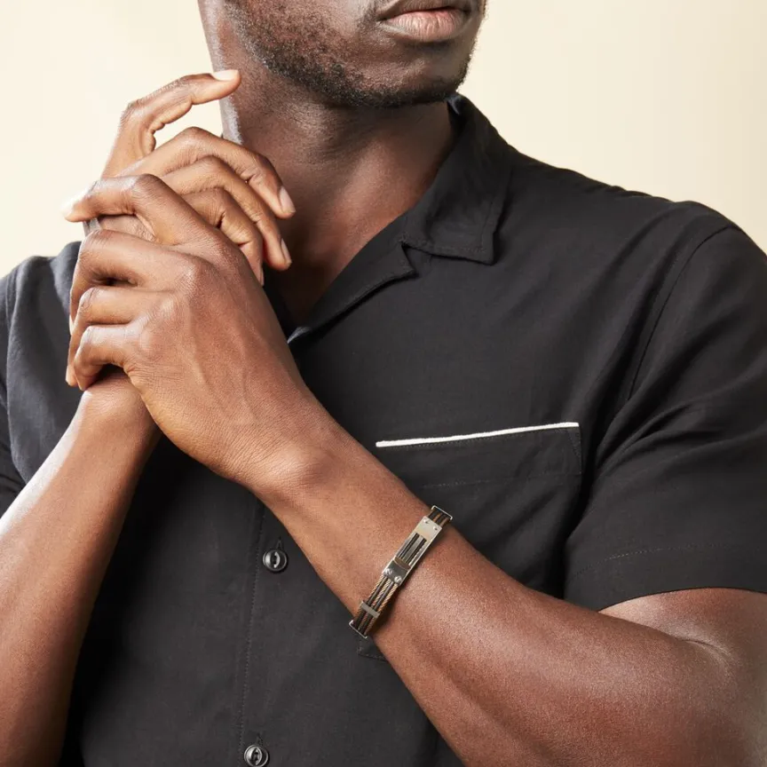 Bracelet Jourdan Or Rose Et Acier + Cables Marron Et Caoutchou 21cm Fz062h
