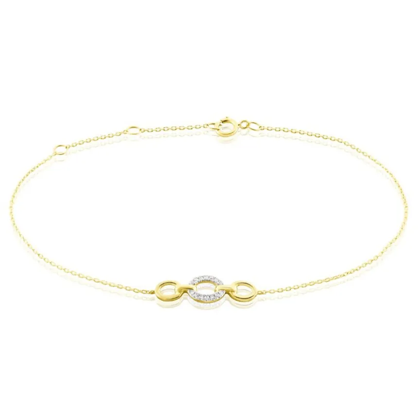 Bracelet Or Jaune 375/1000 Forme Triple Cercle Pavage Diamants Maille Forçat 18cm