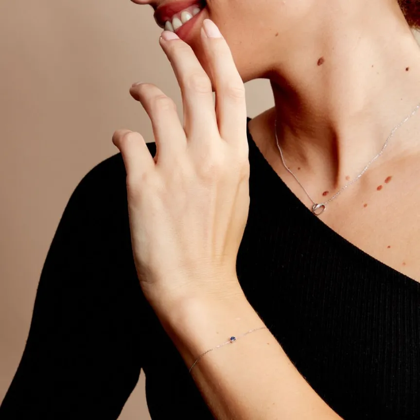 Bracelet Solitaire Or Blanc 375/1000 Saphir Serti Griffes 0.12ct Maille Forçat 15cm