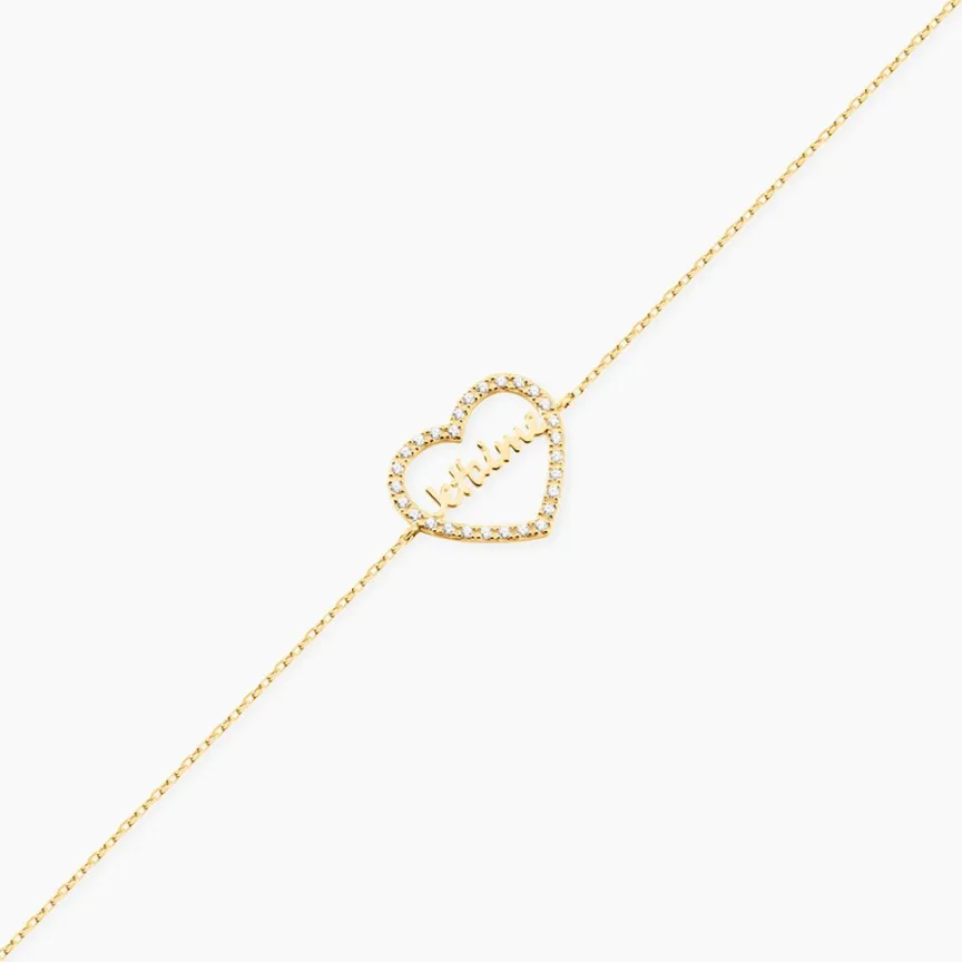 Bracelet Or Jaune 375/1000 Entourage Coeur Message Je T’aime Oxydes De Zirconium Serti Pavage Maille Forçat 18cm