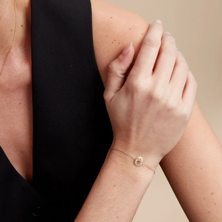 Bracelet Or Jaune 375/1000 Pastille Avec Etoile Ajouree Et 1 Amethyste Centrale 0.04cts Serti Griffes Maille Forcat 16+2cm
