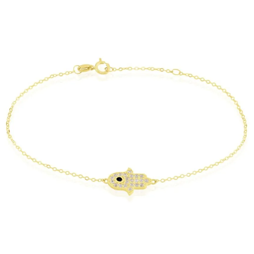 Bracelet Or Jaune 375/1000 Motif Main De Fatma Pavage Oxydes Blancs Et Bleu Maille Forçat 16+2 Cm