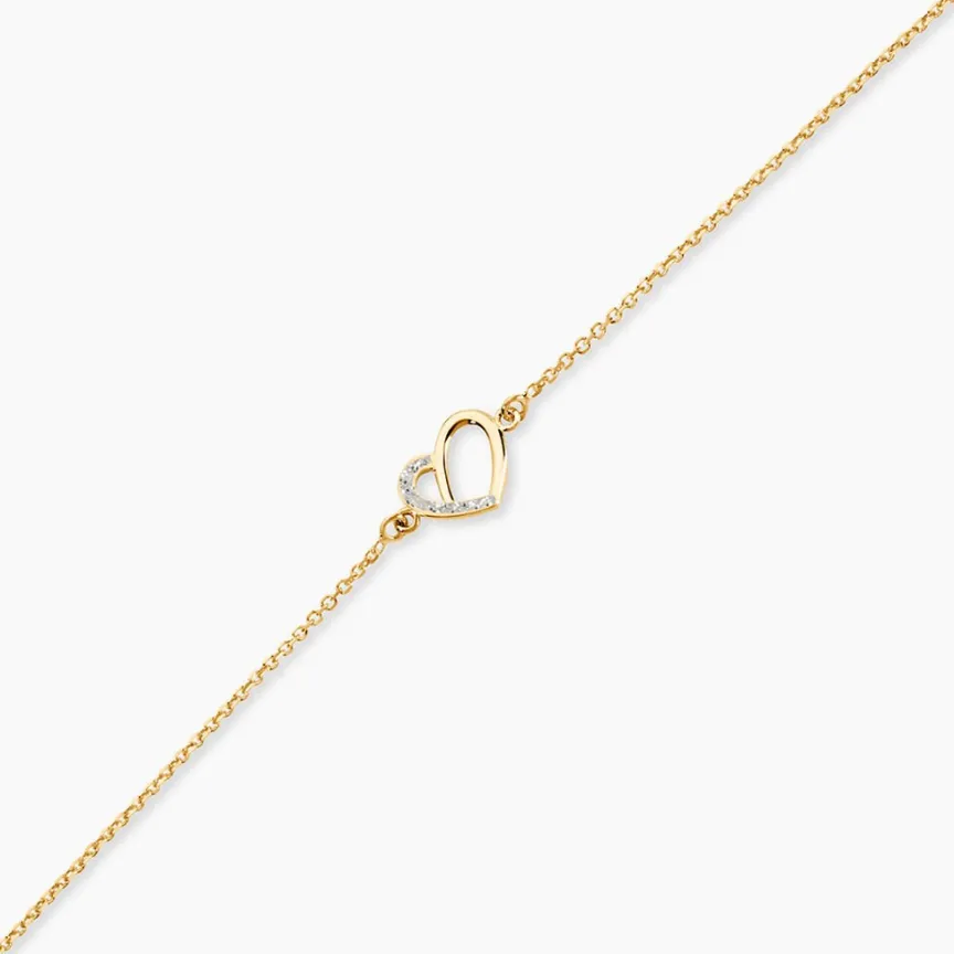 Bracelet Or Jaune 375/1000 Coeur Ajoure Glitter Argente Maille Jaseron 16+2cm