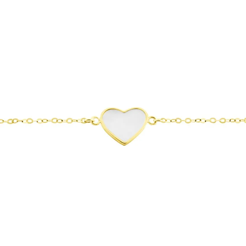 Bracelet Or Jaune 375/1000 Coeur Nacre Blanche Maille Jaseron 16+2cm