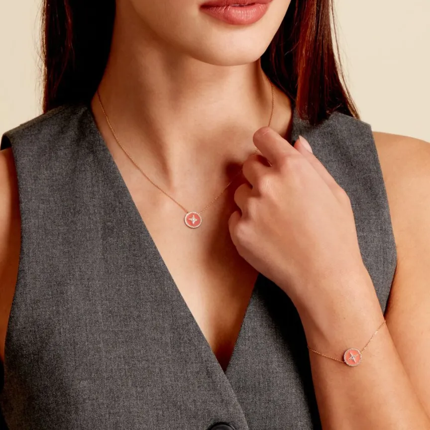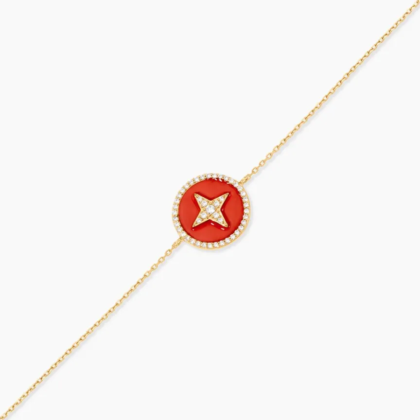 Bracelet Or Jaune 375/1000 pastille Email Corail Etoile Du Berger Pavage Oxyde Zirconium Chaine Maille Forcat 16+2cm