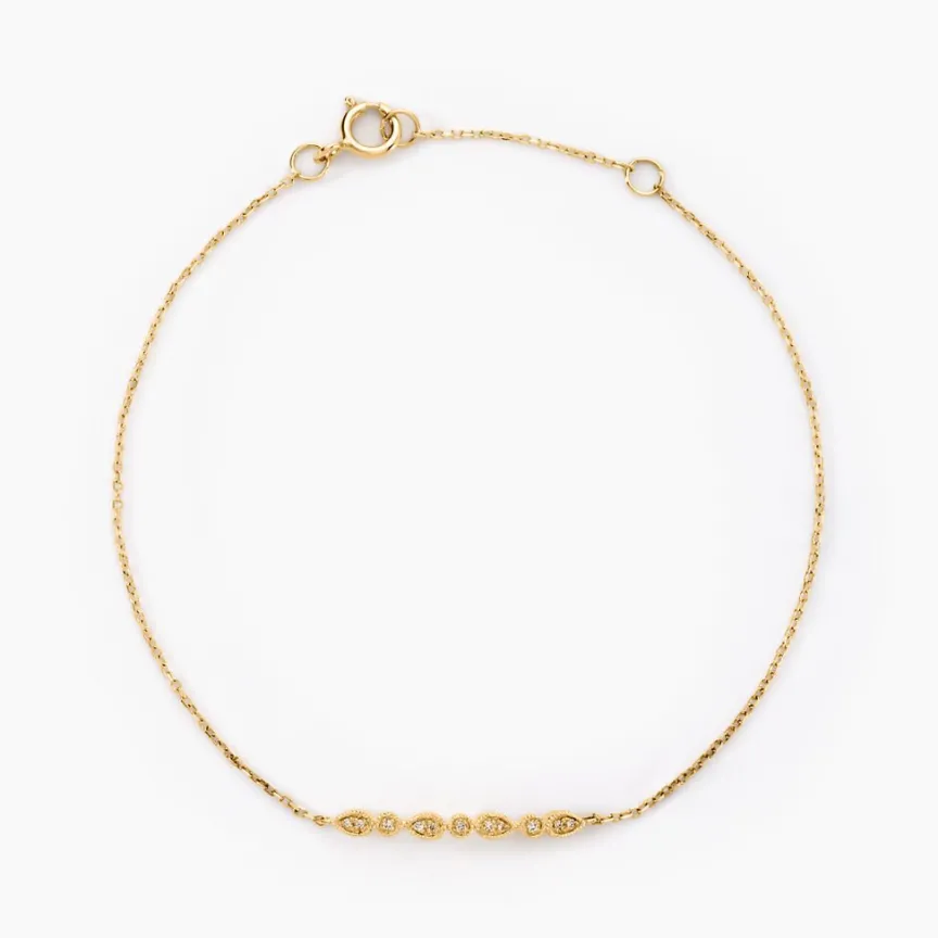 Bracelet Or Jaune 375/1000 Barre Gouttes Et Ronds Effet Perle Pavage Diamants Maille Forcat 16+2cm