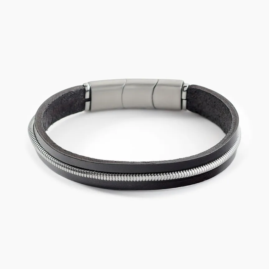 Bracelet Jourdan Rodney Cuir Noir Acier Argente 21cm Jh150187b