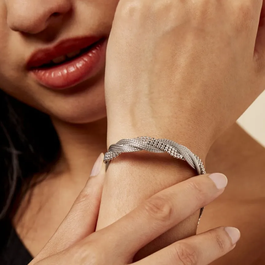 Bracelet Argent Blanc 925/1000 Maille Entrelacee Filet Et Boule Diamante 21cm