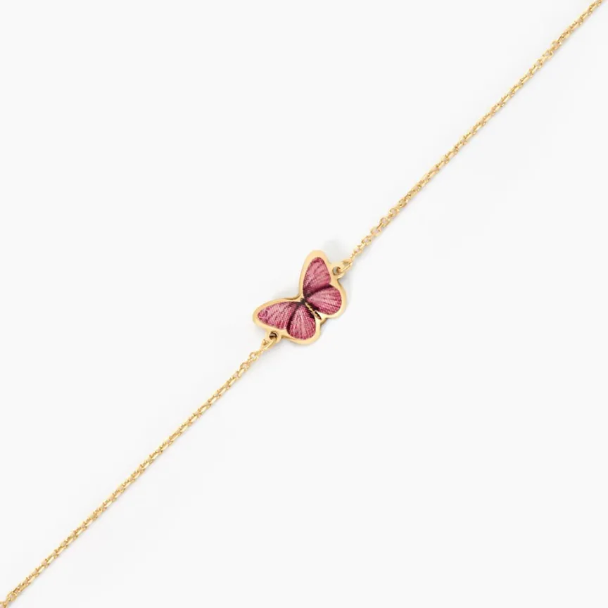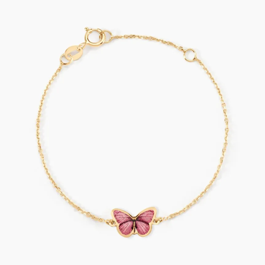 Bracelet Or Jaune 375/1000 Papillon Smalto Rose Maille Jaseron 14cm