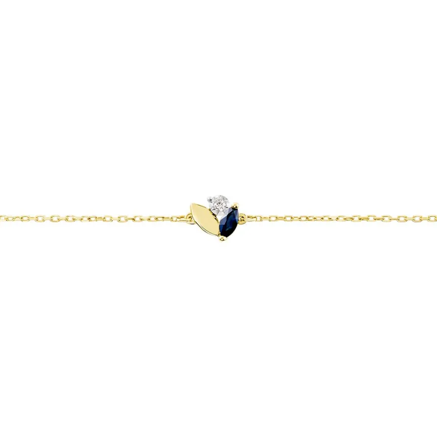 Bracelet Or Bicolore Jaune Et Blanc 375/1000 Fleur Saphir Navette 0.106cts Serti Griffes Et Diamants 0.01cts Serti Illusion Maille Forçat Ronde 16+2cm