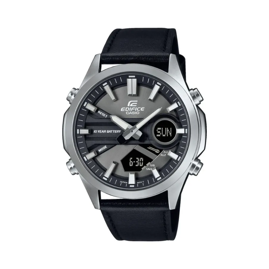 Montre Casio Acier Argente Ronde Quartz 45.5mm Fond Gris Bracelet Cuir De Vache Noir Efv-c120l-8aef