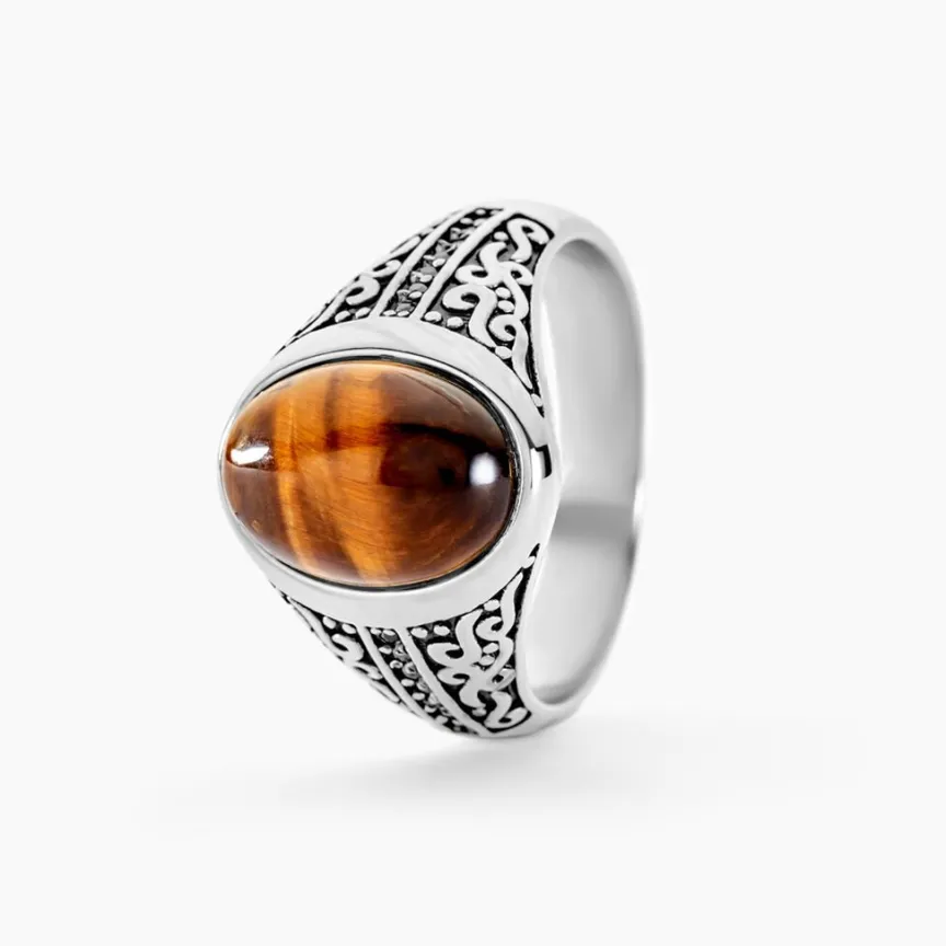 Chevaliere Acier Inoxydable Gris Vieilli Plateau Ovale 艙il De Tigre