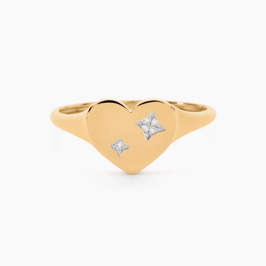 Chevaliere Or Jaune 375/1000 Plateau Coeur Diamants 0.004cts Serti Etoile