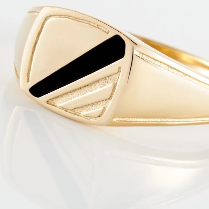 Chevalière Plaqué Or Jaune Forme Carré Striee Email Noir
