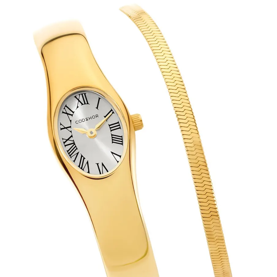 Coffret De Montre Codhor Colette Alliage Doré Quartz Ovale 18mm Fond Argenté Bracelet Jonc Alliage Doré + Bracelet Maille Serpent Dore P101205-a