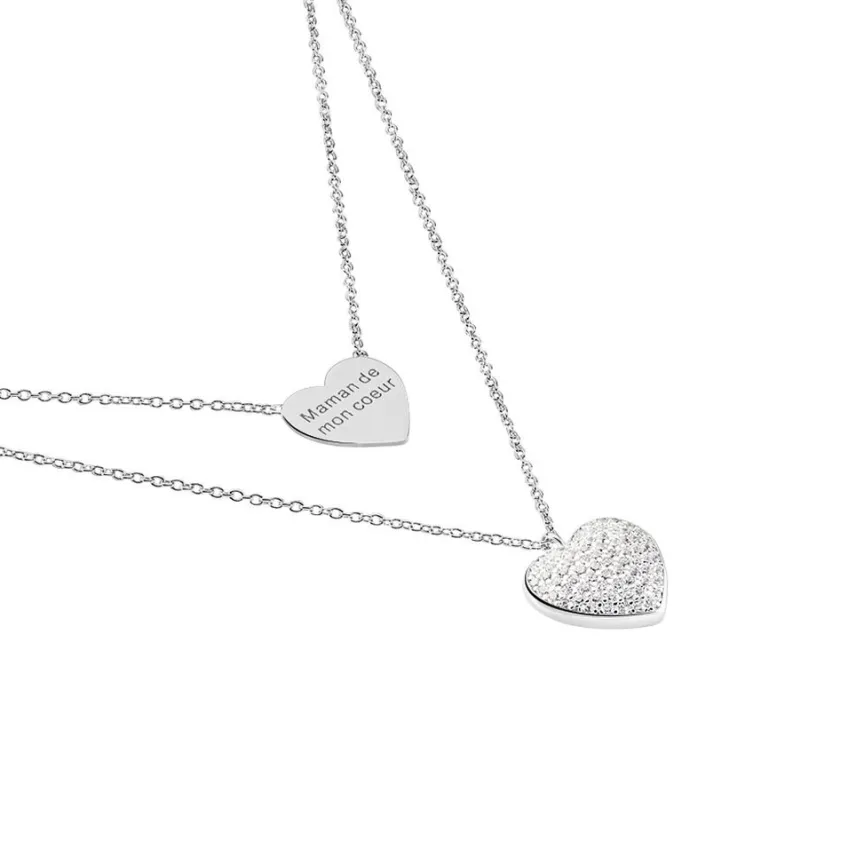 Collier Argent 925/1000 Double Chaines Motifs C艙ur Pavage Oxydes De Zirconium Et C艙ur Message 45cm