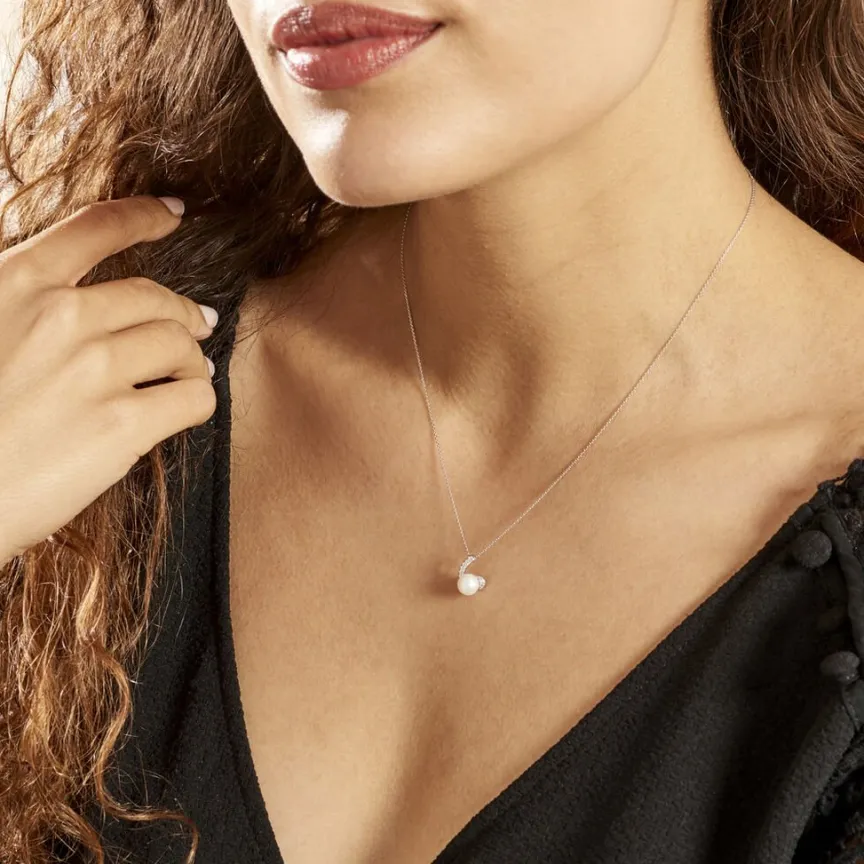 Collier Or Blanc 375/1000 Forme Goutte Perle De Culture 6-6.5mm Et Oxydes De Zirconium Maille Forçat 38+4cm