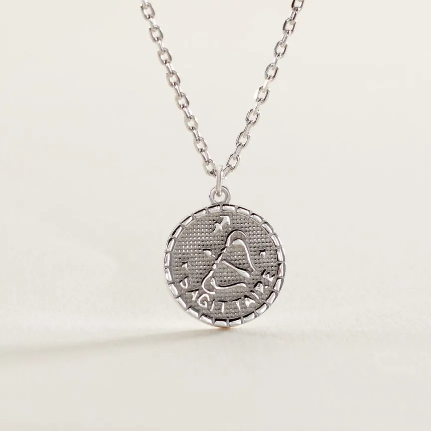 Collier Argent Blanc 925/1000 Pastille Signe Du Zodiaque Sagittaire Maille Forcat 55cm