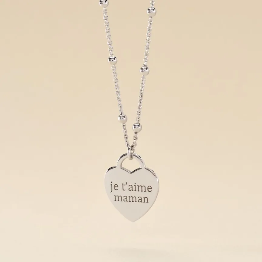 Collier Argent Blanc 925/1000 C艙ur Message Je T’aime Maman Chaine Maille Forçat Et Boules 45cm
