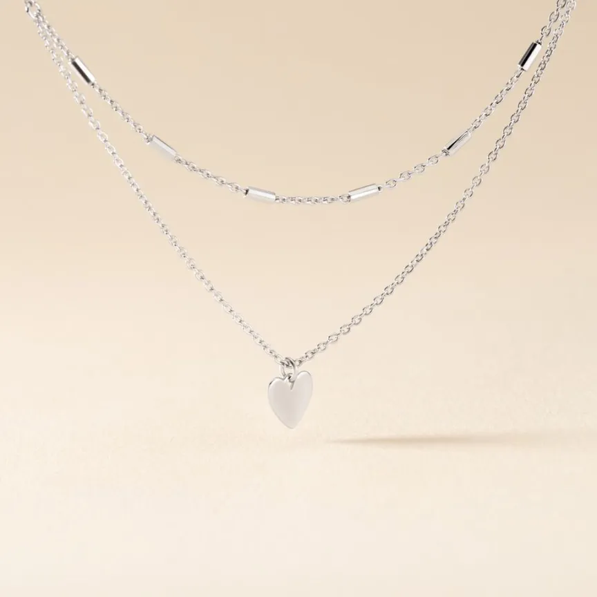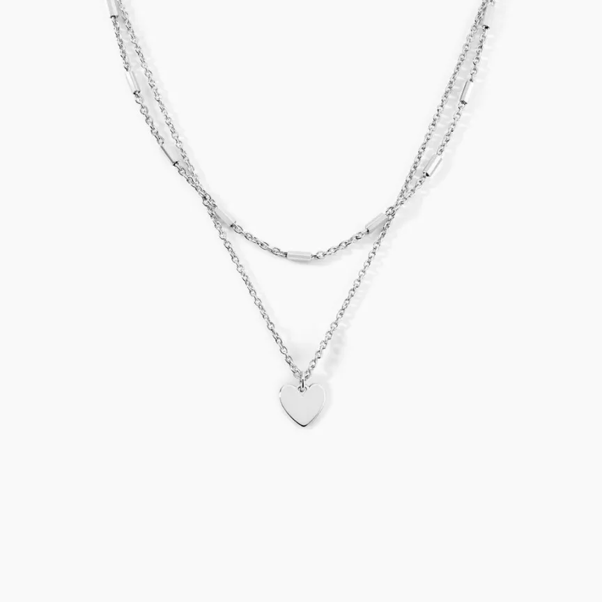 Collier Argent Blanc 925/1000 C艙ur Double Mailles Forcat Et Fantaisie 45cm