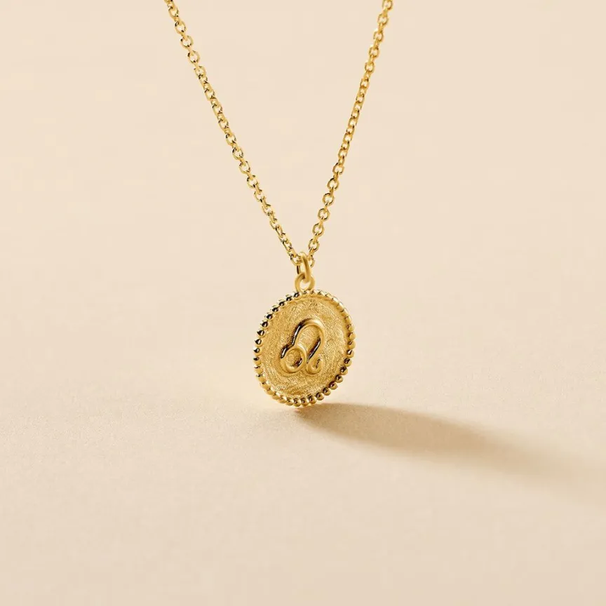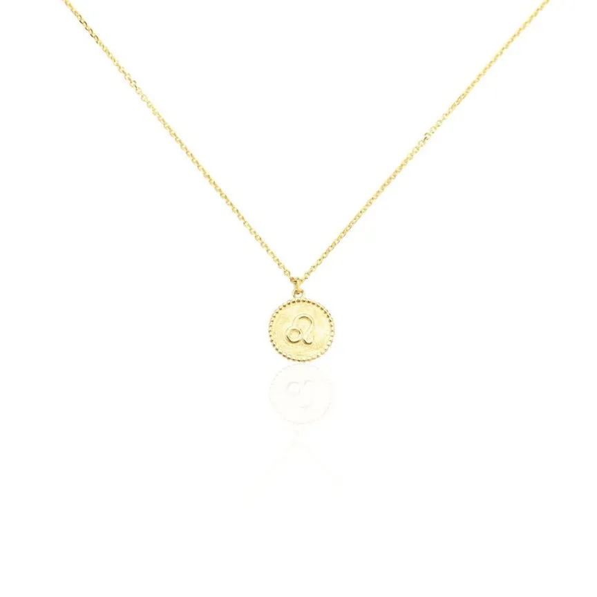 Collier Or Jaune 375/1000 Pastille Zodiaque Lion Brosse Effet Perlee Maille Jaseron 40+2cm