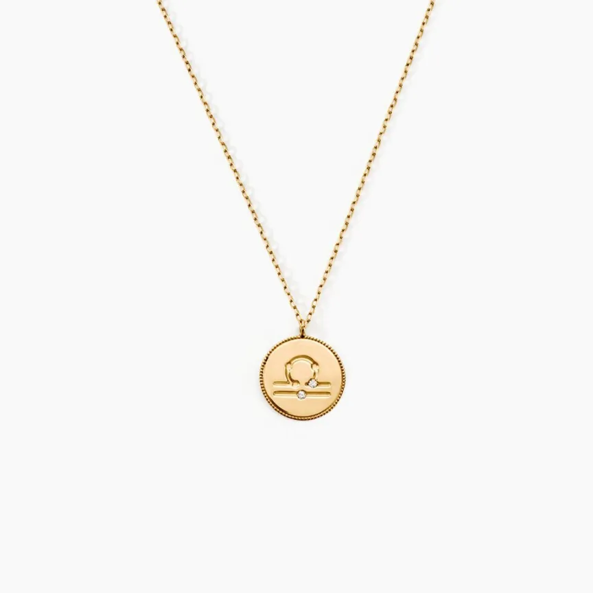 Collier Or Jaune 375/1000 Pastille Zodiaque Balance Diamant Maille Forcat 40+2cm