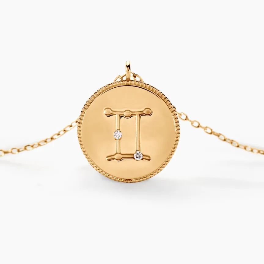 Collier Or Jaune 375/1000 Pastille Zodiaque Gemeaux Diamant Maille Forcat 40+2cm