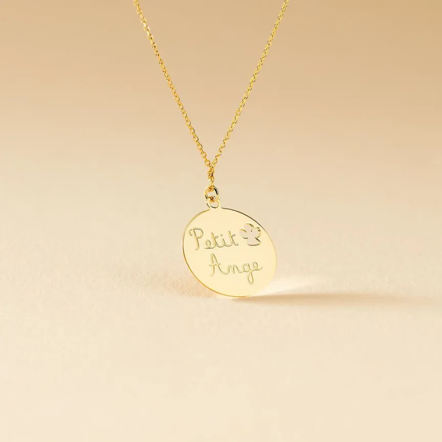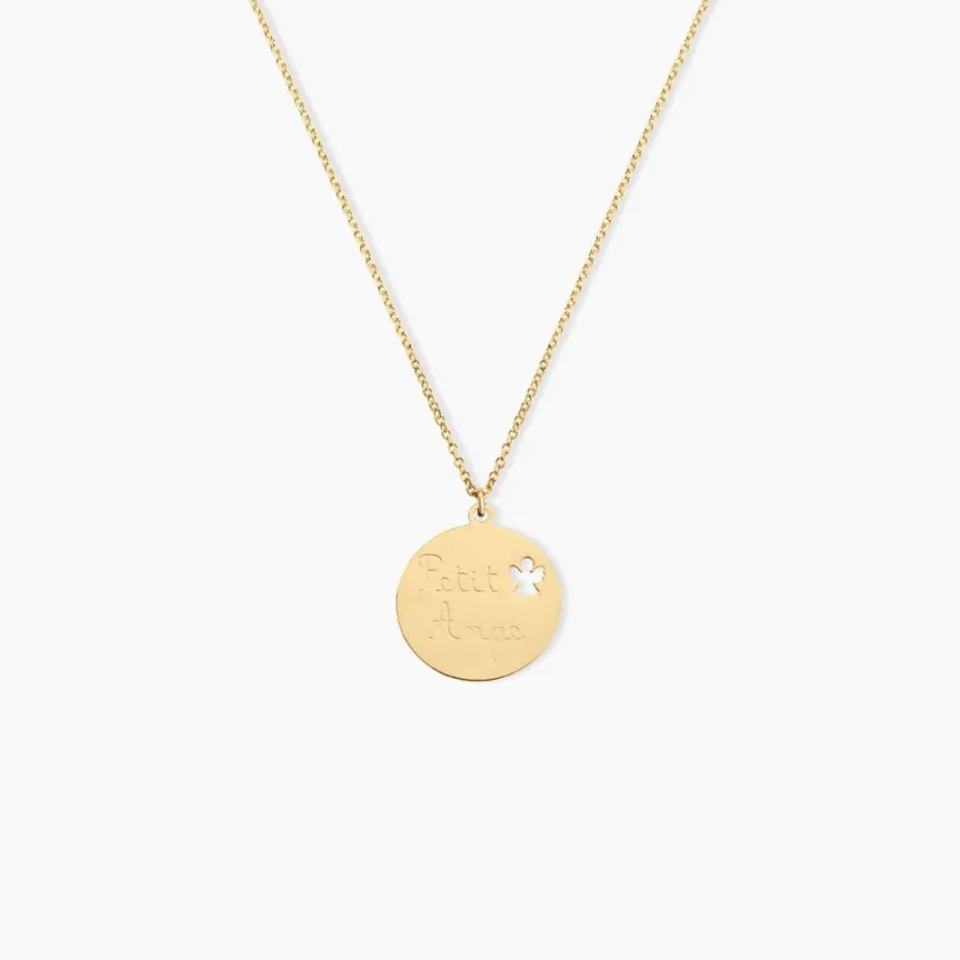 Collier Or Jaune 375/1000 Pastille Message Petit Ange Maille Jaseron 38cm