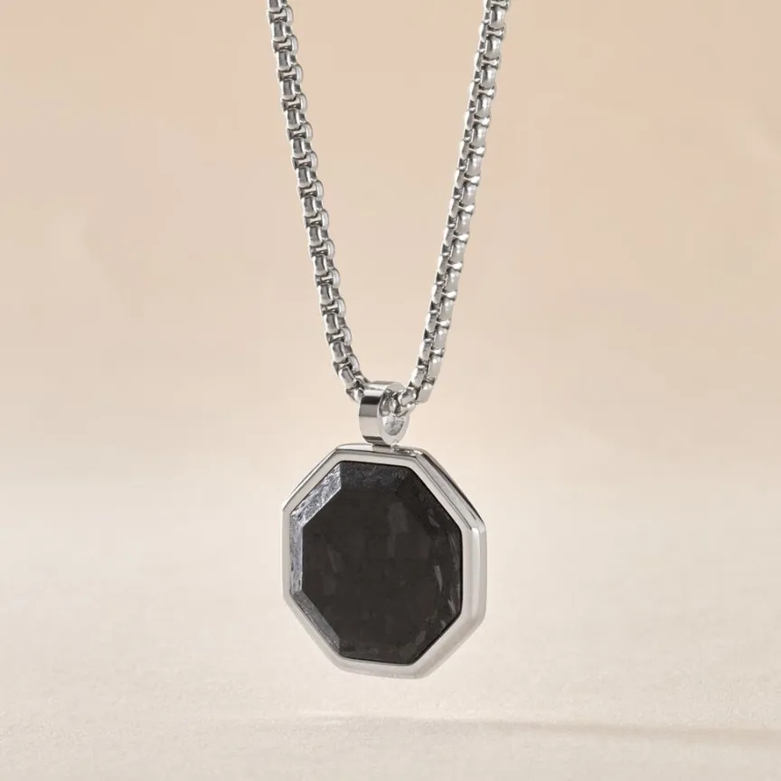Collier Acier Blanc Octogone Carbone Noir Maille Vénitienne 55cm