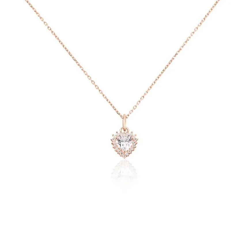 Collier Argent Rose 925/1000 C艙ur Entourage Oxydes De Zirconium Serti Griffes Maille Forçat 42+3cm