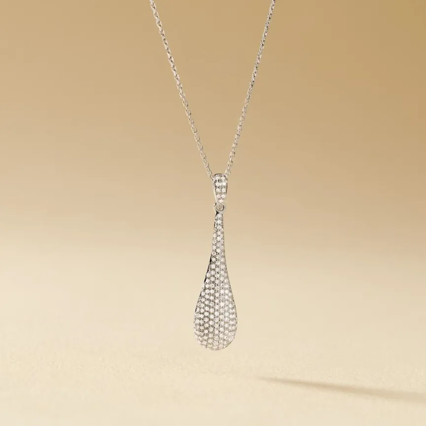 Collier Or Blanc 375/1000 Forme Goutte Pavage Diamants 42cm