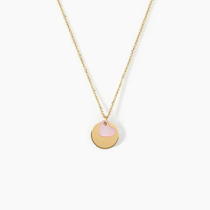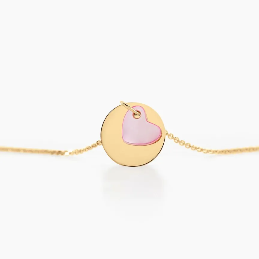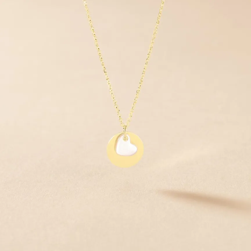 Collier Or Jaune 375/1000 Pastille + Motif C艙ur Pendant Nacre Rose Maille Jaseron 38cm