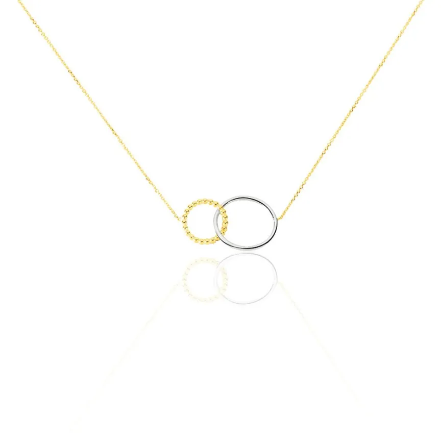Collier Or Bicolore 375/1000 Double Cercles Ajoures Effet Perlé Et Lisse Maille Jaseron 42cm