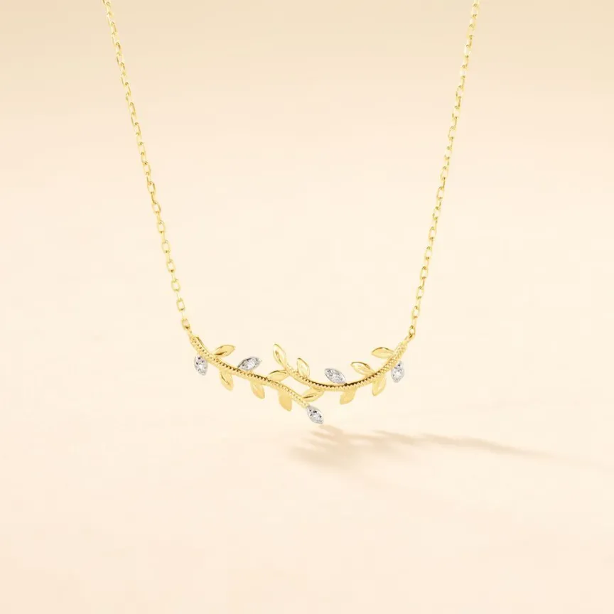 Collier Or Jaune 375/1000 Feuilles Semi Pavage Diamants Ronds Maille Forcat 40+2cm