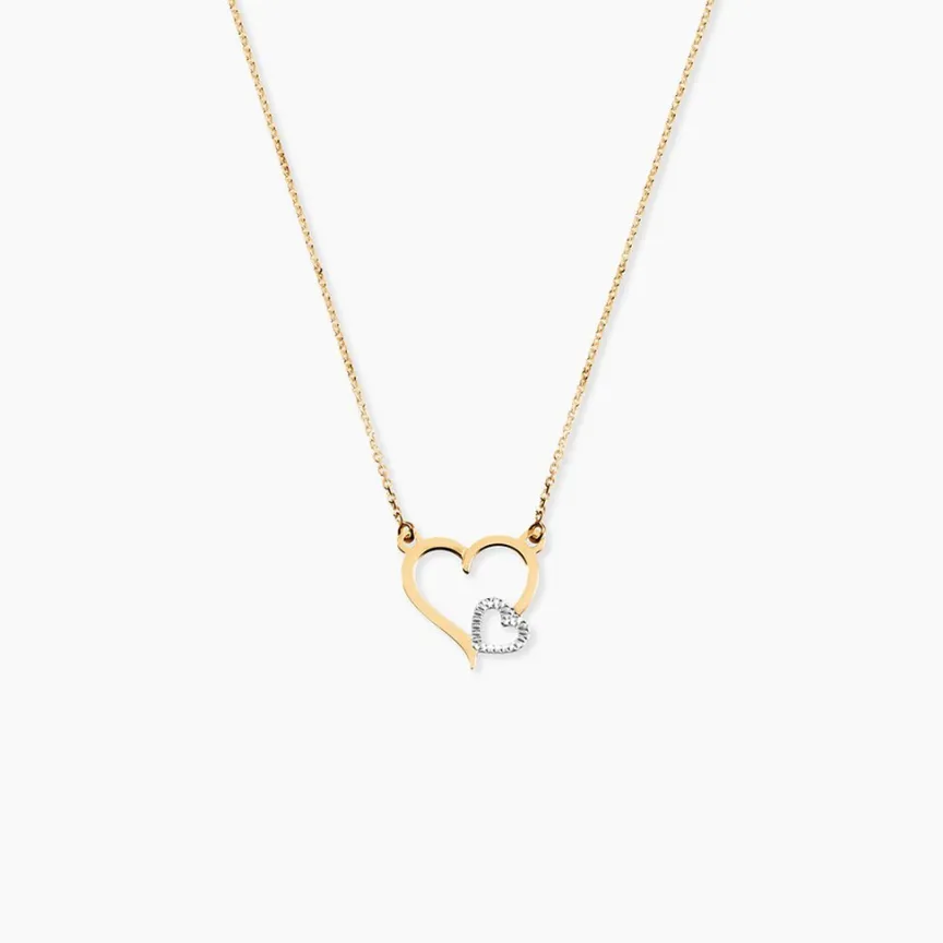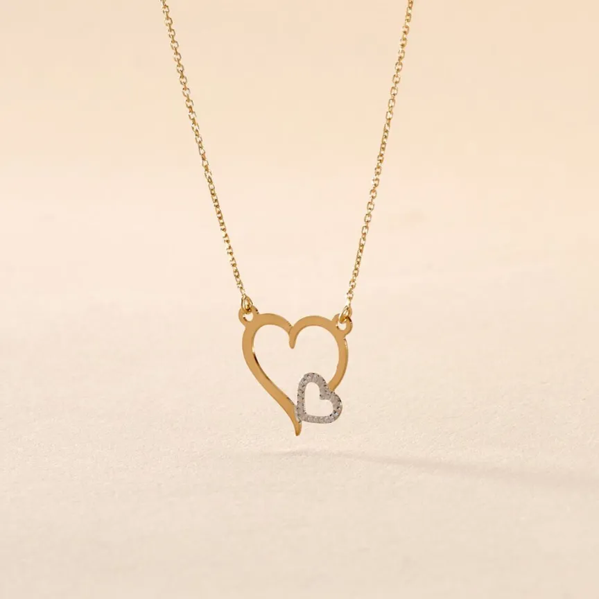 Collier Or Bicolore 375/1000 Double C艙urs Ajoures Avec 1 C艙ur Argente Penche Effet Fantaisie Maille Jaseron 42cm